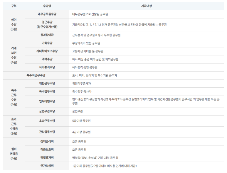 - 가족수당: 부양가족이 있는 공무원에게 지급