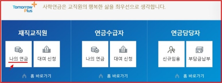 사학연금 홈페이지에 들어가주셔서 로그인을 하시고 홈페이지 아래쪽을 보시면 위의 화면이 나옵니다. 여기서 재직 교육원 '나의 연금'으로 들어갑니다.