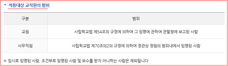 - 사립학교 중 유치원, 각종학교, 기술학교, 공민학교 등의 정규 교직원