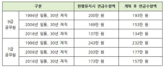 | 수령액의 계산 하는 방법은 평균기죽소득월액 * 재직기간별 적용비율 * 재직간 * 연금지급률을 모두 곱하여 계산하는 방법입니다 여기서 평균기준소득월액은 성과 상여금, 직무 성과금, 시간외 근무수당, 야간근무 수당 등을 포함하며 호봉에 수당을 모두 더한 세전 소득을 의미한다. 또한 복지포인트 기타 비과세 소득의 경우 제외한다. 9급공무원 현행유지시 / 개혁후 1996년 임용, 30년 재직 200만원 193만원 2006년 임용, 30년 재직 169만원 153만원 2016년 임용, 30년 재직 137만원 134만원 7급공무원 현행유지시 / 개혁후 1996년 임용, 30년 재직 243만원 232만원 2006년 임용, 30년 재직 203만원 177만원 2016년 임용, 30년 재직 173만원 157만원 |