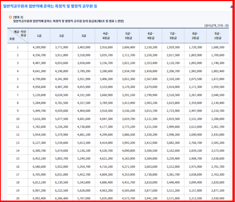 참고로 다른 정확한 공무원 월급표를 확인하고 싶으신분들은 인사혁신처 - 공무원 인사제도 - 성과 보수제도 - 공무원봉급표를 눌러보시면 년도별로 확인 가능하십니다.