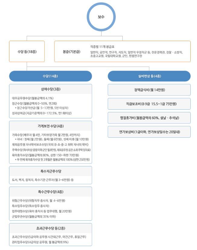 현 공무원 보수체계는 인사혁신처 홈페이지를 참고하시면 자세하게 확인하실 수 있는데요, 공무원 보수는 18종의 수당과 봉급(기본급)으로 구성되어 있습니다.
