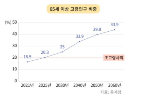 얼마나 고령화가 빠르냐면 우리나라는 가장 빠르게 고령화가 진행되는 국가로 뽑혔습니다. 참고로 3년 후 한국 인구 5명 중 1명은 65세 이상일 것으로 예상되고 있습니다
