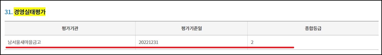 ▲ 설립목적을 시작으로 직원현황 및 조직도 등의 다양한 정보가 포함되어 있습니다. 가장 처음으로 먼저 확인해볼 경영실태평가입니다. 31번에 위치하고 있는 경영실태평가를 확인하여 현재 경영의 부실여부를 판단해 볼 수 있습니다.