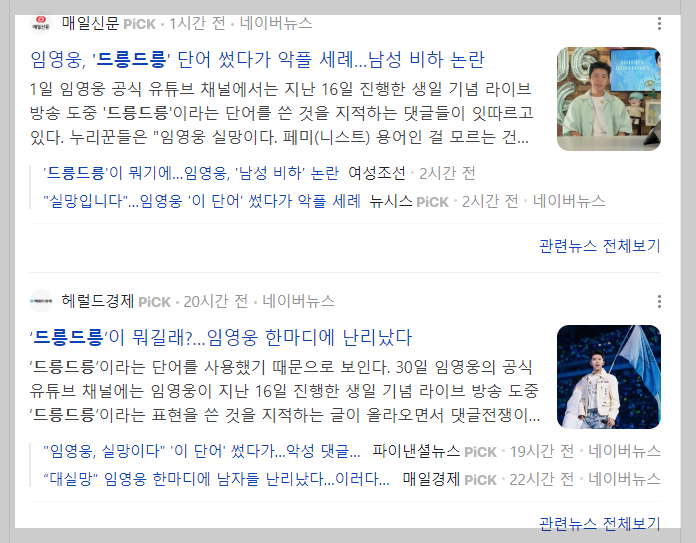 현재 가수 임영웅이 논란이 되고 있는 것은 마음이 드릉드릉하다는 표현이었는데요. 과연 이 말을 임영웅이 뜻을 알고 다시말해 남성을 비하하거나 혐오의 표현이라는 것을 알고 했을까에 관심을 끌고 있는 것입니다. 팬들은 곧 대형 예능 방송인 삼시세끼에서 만날 것이라는 기대감을 표현한 것이라 생각하지만 남초 커뮤니티에서는 댓글로 공격을 하고 있는 상황입니다.