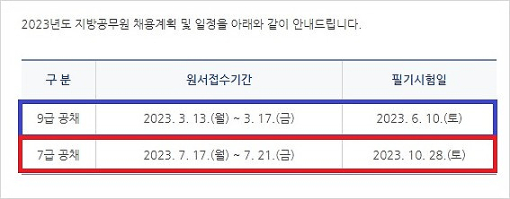 9급의 경우는 2023년 3월 13일 월요일부터 3월 17일 금요일까지 지방자치단체 인터넷원서접수센터 홈페이지를 통해 지방직 공무원 원서접수가 가능한데요, 이후 원서접수가 마감되고 나면 6월 10일 토요일에 필기시험이 치러진다고 알고 계시면 되겠습니다!