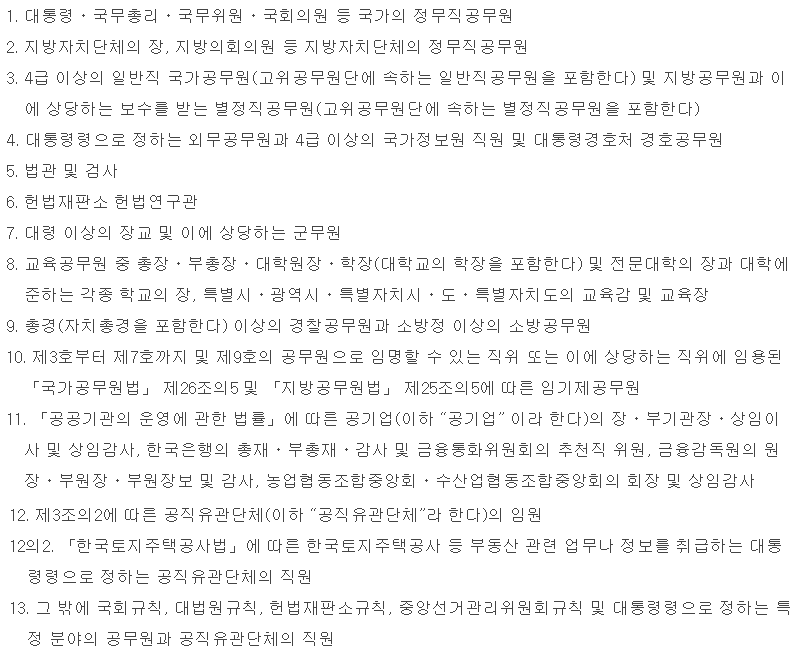 언뜻 보면 4급 이상 고위 공무원에만 적용하는 것 같지만 제3조 제1항 제13호의 "대통령령으로 정하는 특정 분야의 공무원"을 보면 특정 분야에 대해서는 하위직 공무원도 포함되어 있습니다.