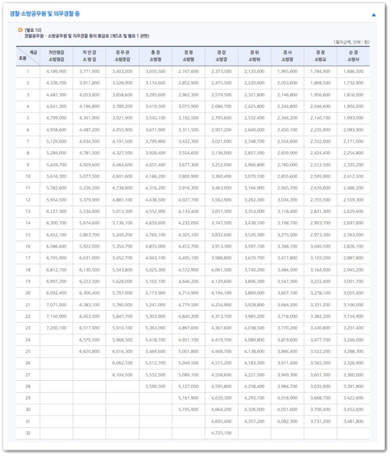 경찰이 제공받게 되는 기본 금액은 경찰공무원, 소방공무원과 동시에 의무경찰 등의 봉급표를 바탕으로 직급이나 호봉에 맞춰 받게 됩니다.
