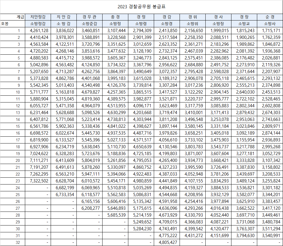 간단하게 2023년 경찰 공무원 봉급표에 대한 정보를 알아보았는데요 경찰공무원은 2023 경찰공무원 봉급표와 여려가지 수당들, 각종 복지혜택들을 받을 수 있습니다.